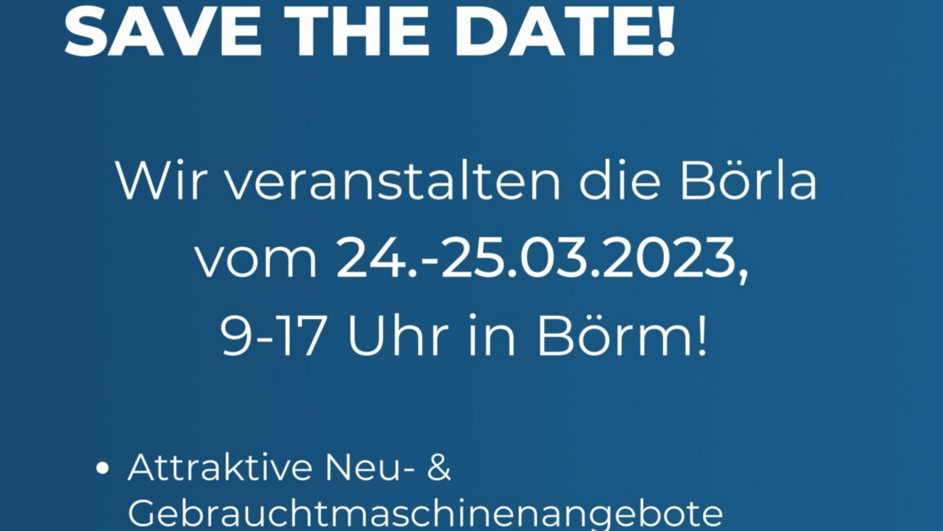 Nach 4 langen Jahren geht es endlich wieder los und wir dürfen Euch alle wieder zu uns nach Börm einladen! Vom 24. bis 25. März, 9-17 Uhr, findet unsere bekannte Hausmesse die „Börla“ wieder statt. Neben aktuellen Neu- und Gebrauchtmaschinenangeboten, wird es auch einen Regio-Markt mit Anbietern aus der Region und natürlich auch ein Gewinnspiel vor Ort geben. Kommt vorbei – Wir freuen uns auf Euch!