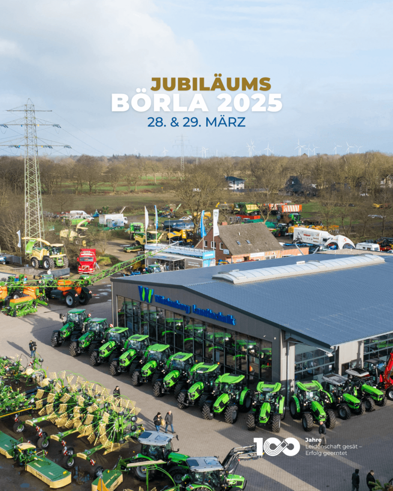 Im Jahr 2025 feiern wir ein ganz besonderes Jubiläum: 100 Jahre Wüstenberg! Dieses große Ereignis wollen wir gemeinsam mit euch auf unserer traditionellen Hausmesse, der BÖRLA, feiern. Markiert euch jetzt schon den Termin in eurem Kalender, denn am 28. und 29. März 2025 verwandelt sich unser Standort in Börm in das Herzstück der Landtechnikbranche.