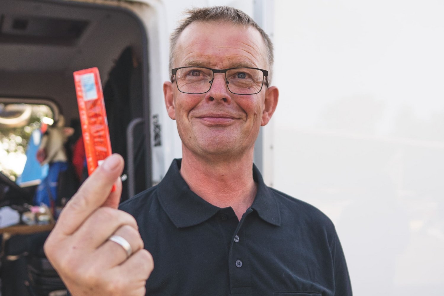 Bernd mit seinem Kinderriegel – so kennen und lieben wir ihn! Mit unserem Mobilshop ist er täglich unterwegs und versorgt unsere Kunden mit den nötigen Utensilien für die Tiere und Stallungen.